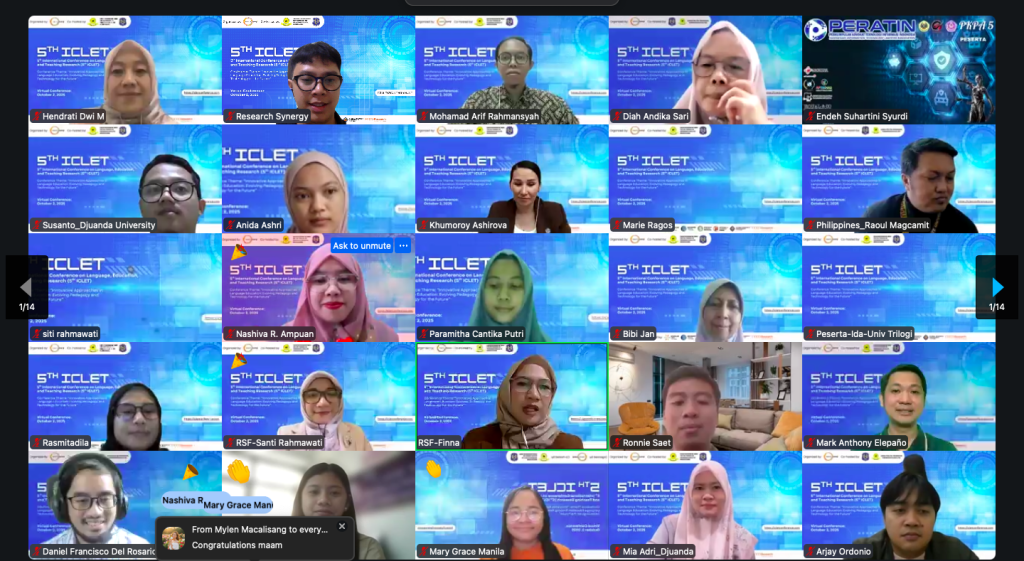 The 5th International Conference on Language, Education, and Teaching Research (5th ICLET) was held successfully on 2 October 2025. Organized by the Research Synergy Foundation, Co-Hosted by Sekolah Pascasarjana & LP3K Universitas Djuanda, Indonesia and National University of Philippines, this conference was held virtually through the online platform.
